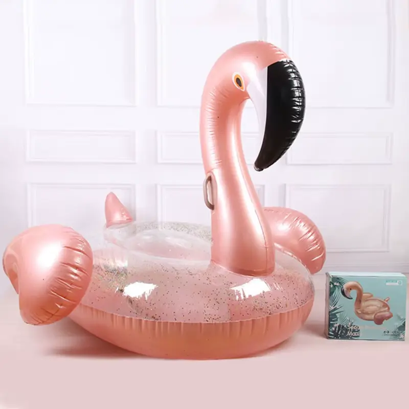 Descripción Inflable en forma de flamenco con glitter dorado✨.Color: Rosa claro🩷 Medidas aproximadas: 138cm x 123cm